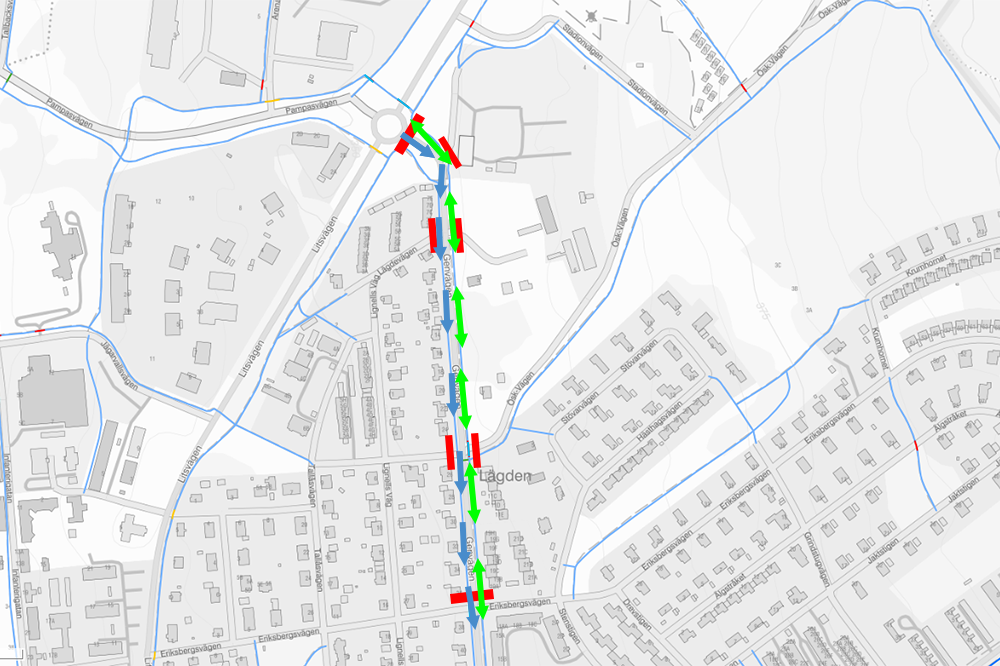 Endast bilburna boende längs Genvägens västra sida, sidan med jämna gatunummer, släpps fram på gång- och cykelbanan, enkelriktat från Litsvägen och mot Fyrvallarondellen - blå pilar i kartan.