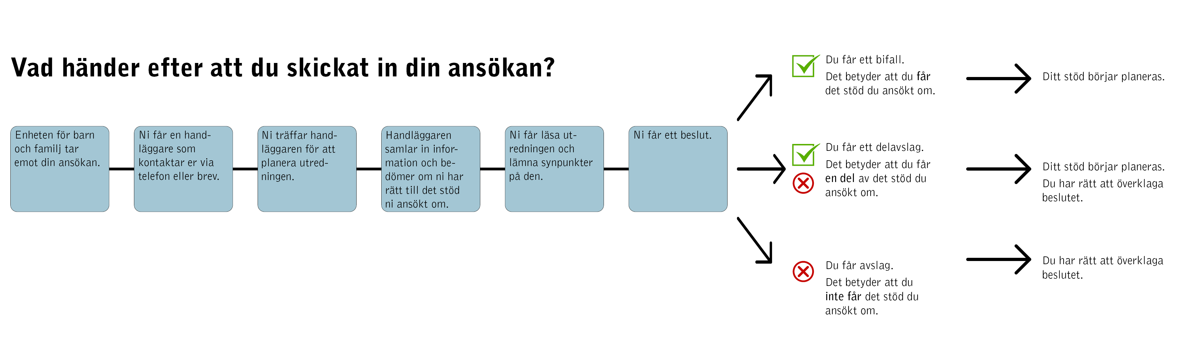 - Handläggaren samlar in information och bedömer om ni har rätt till det stöd ni ansökt om