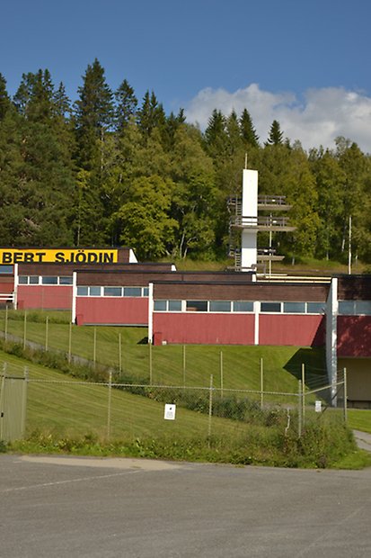 Här är ett antal låga, platta byggnader med tydlig, rationell 1960-talsprägel utplacerade i sluttningen tillsammans med hopptorn, simbassänger och mindre hytter.