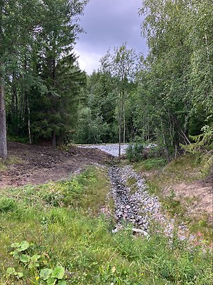 För att stoppa fortsatt grumling i Semsån har vi därför byggt en vall för att få vattnet att stanna upp innan det når ån. Tanken är att partiklar ska hinna sjunka ner till bottnen innan vattnet rinner vidare och att öringen så småningom kommer få lättare att hitta lekplatser för att föröka sig.