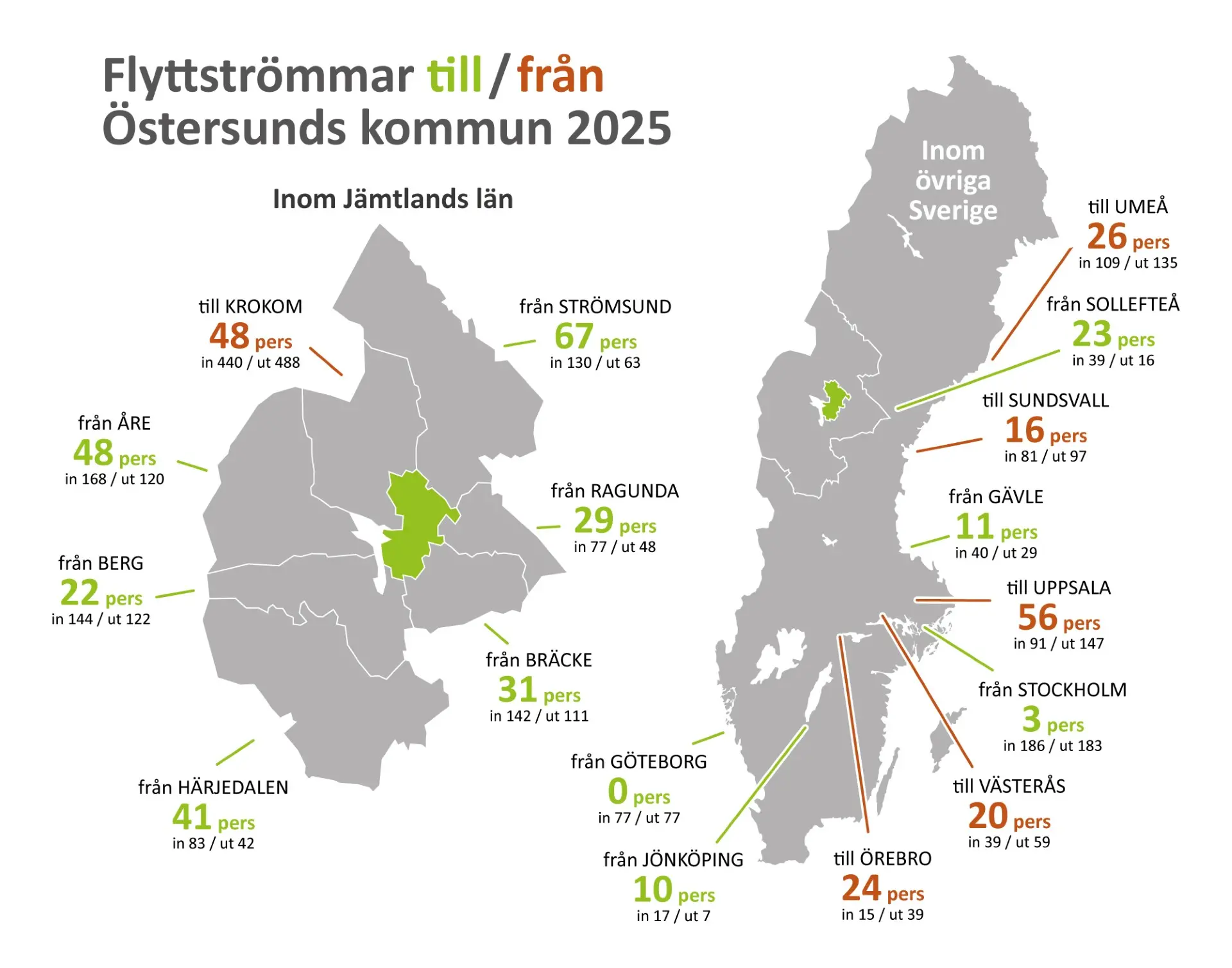 Inom Jämtlands län såg flyttströmmarna till och från Östersunds kommun ut så här 2025: