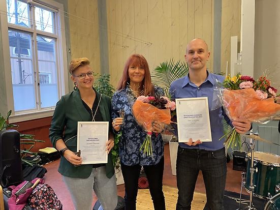 Pristagarna Scenkonst Östersund representerade av Lisa Engman och Sabine Dahlberg. Och Claes Gyllenkrok, idrottsledarpriset. Foto: Östersunds kommun.