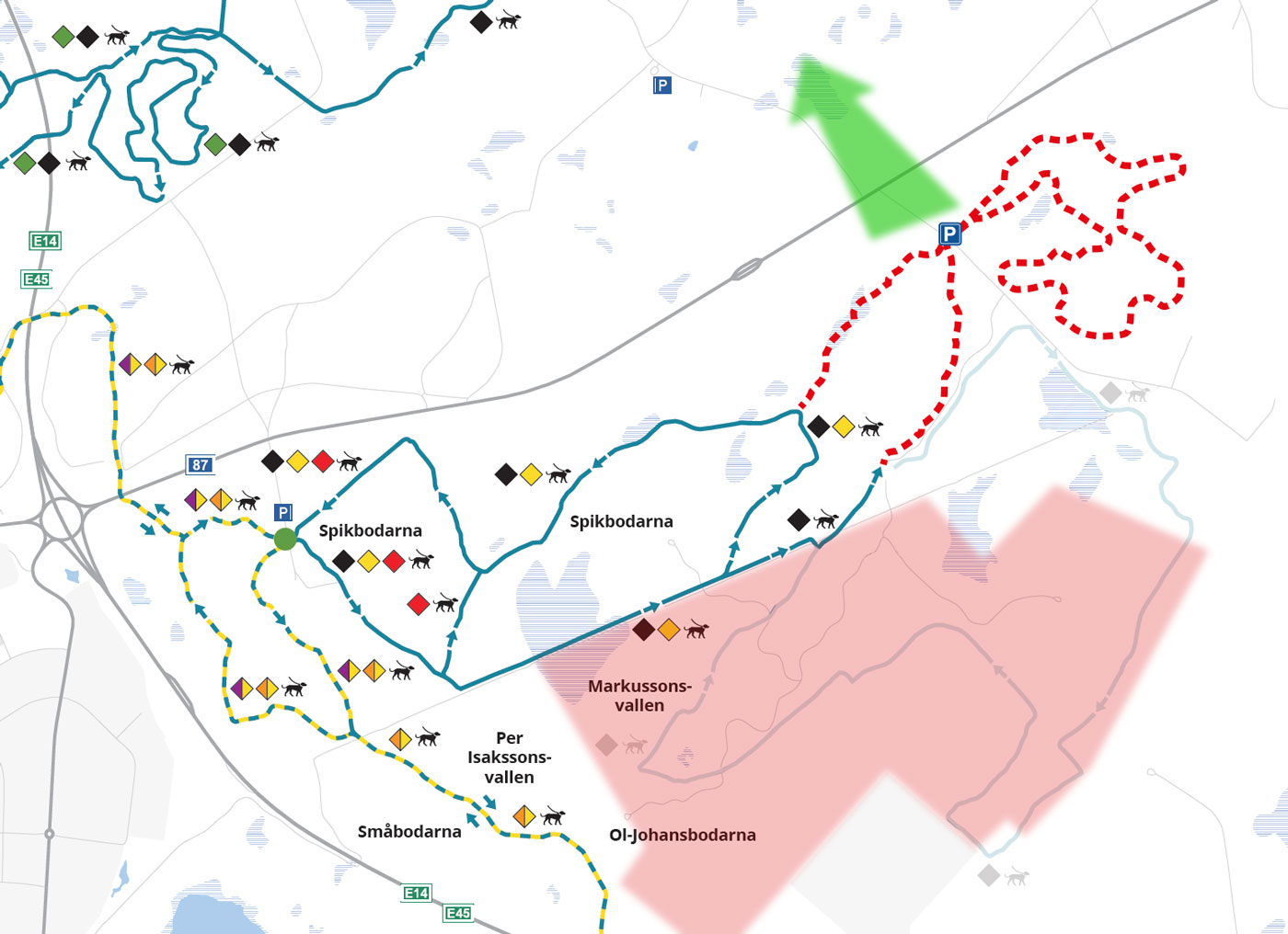 Förstora bildenSkidspår markerat med rödstreckade linjer visar hur de nya skidspåren kommer dras. Den gröna pilen visar hur Spikbodarnas spårområde skulle kunna kopplas ihop med Torråsens. Var passagen över väg 87 skulle kunna ske finns inget beslut om ännu. Röda området visar föreslaget detaljplaneområde och var skid- och motionsspår sannolikt försvinner vid en industriell etablering. Detaljplaneområdets form och areal kan komma att förändras under processens gång.